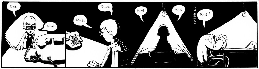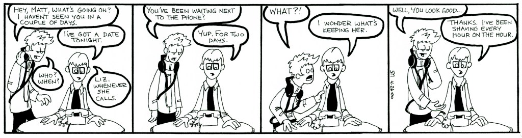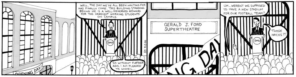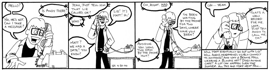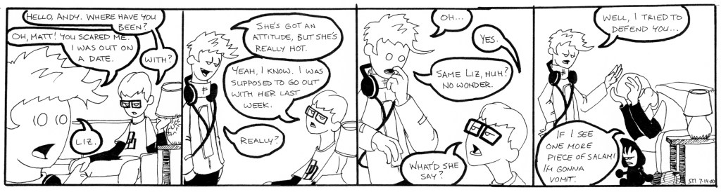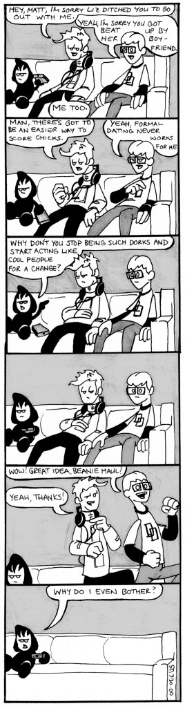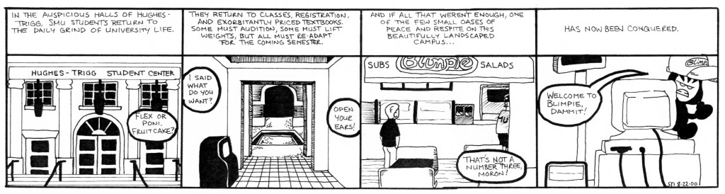 The second story arc ran from April to September 2000. SMU’s Summer break occurred shortly into the story, hence the oddly placed cliffhanger. These strips see the first appearances of Liz and her boyfriend, Lugnut, as well as some much improved art. Also notable: Beanie Maul’s job at Blimpie Subs, which I thought was going to be fun story-wise, but turned out to be super-boring, makes it’s debut here.