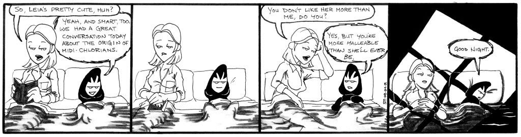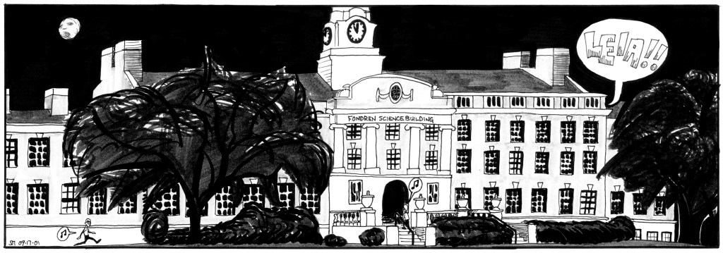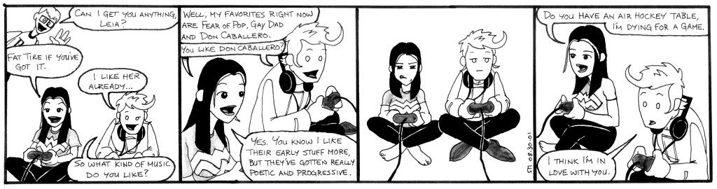 These strips most notably feature the introduction of Matt’s girlfriend, Leia, who is pretty and awesome, to everyone’s surprise. Also introduced is Mail-Man’s mad scientist boss, Dr. Wilé, in his only appearance in the original strip. At this time, I began churning out four strips per week, so the characters began to move and act a lot better, but due to my increased output, the art is still fairly rushed looking. These strips were published in the SMU Daily Campus from August to September 2001.