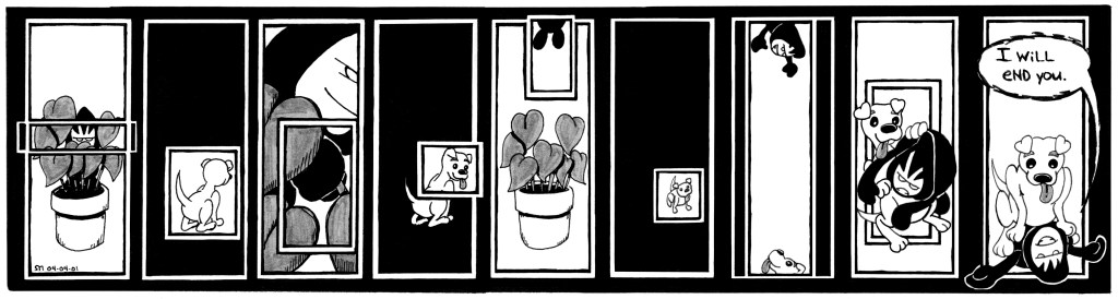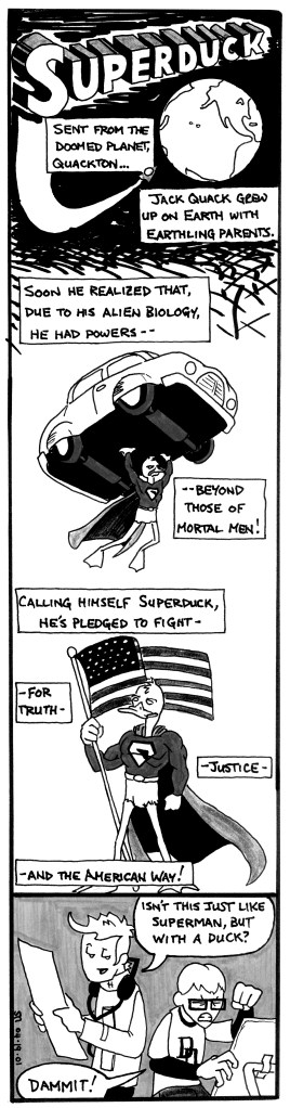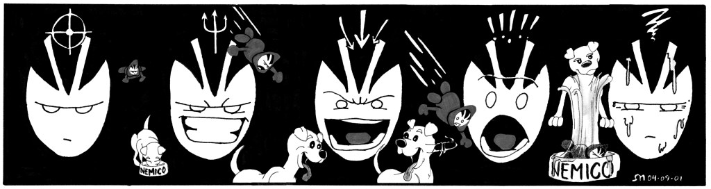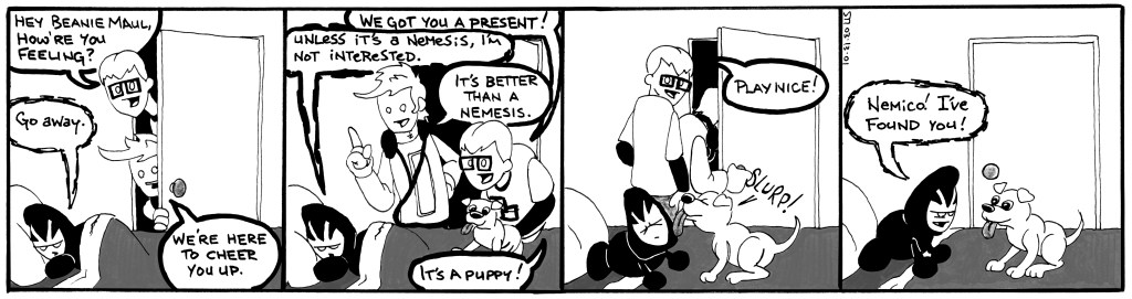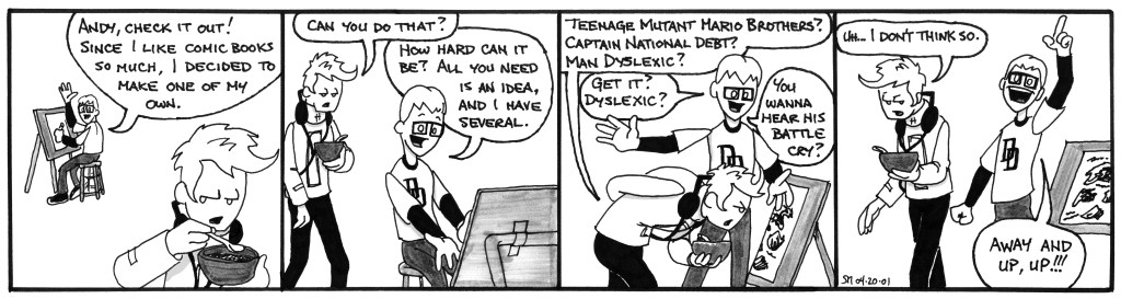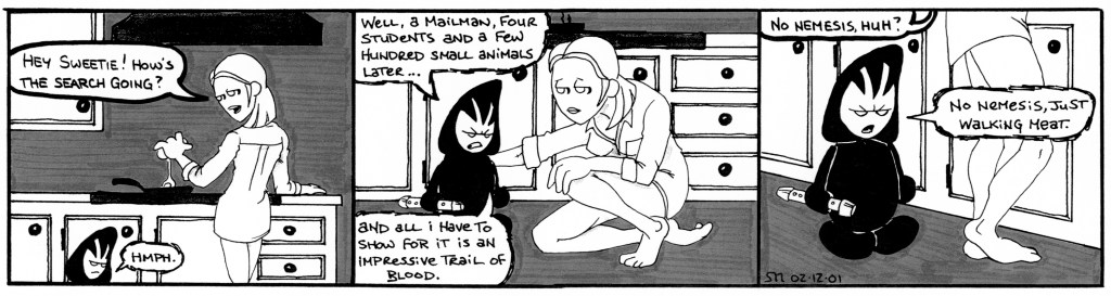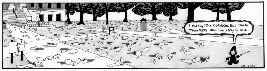 Lots of good stuff happening in this arc. Beanie Maul’s nemesis search includes the first appearances of The Dangler, Mail-Man and Nemico, as well as the senseless slaughter of countless innocent squirrels. The last four strips where Matt attempts to draw his own comic also feature some old characters I “created” in elementary school. This arc was published in SMU’s Daily Campus from February to May 2001.