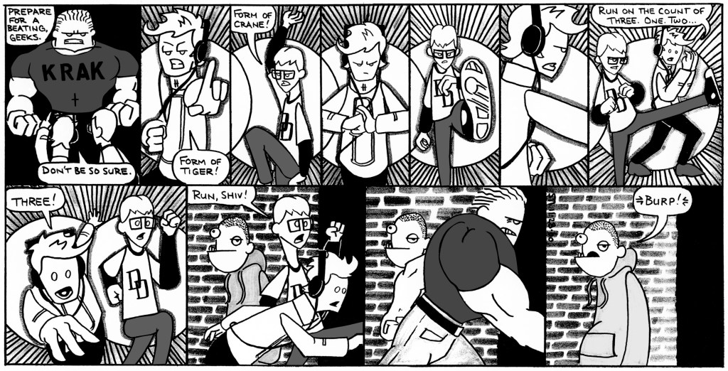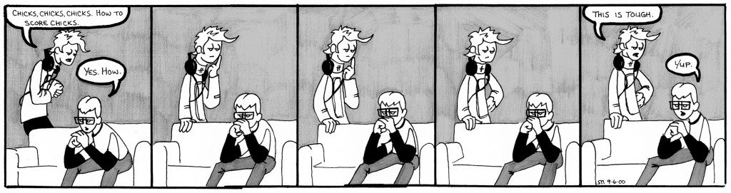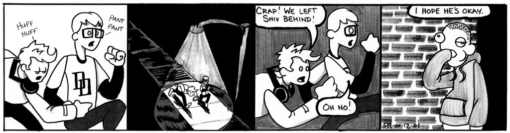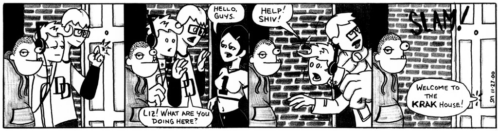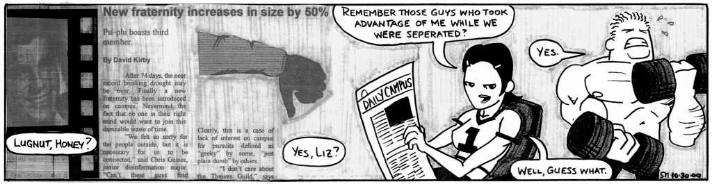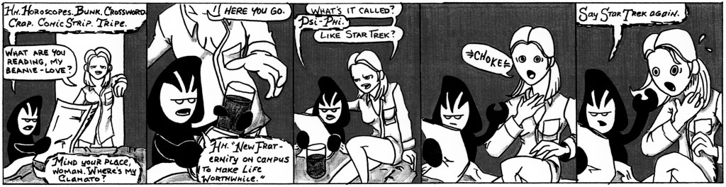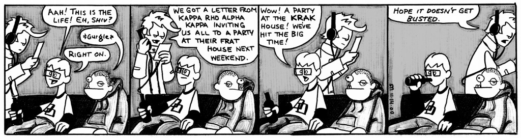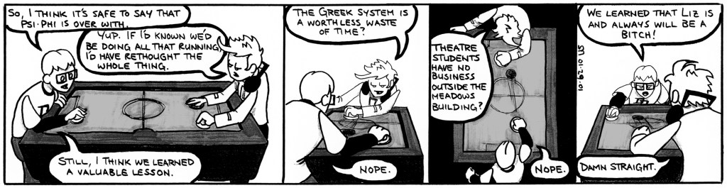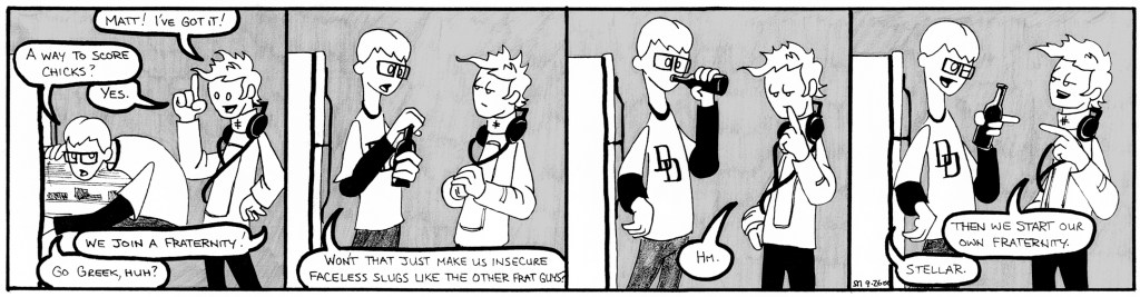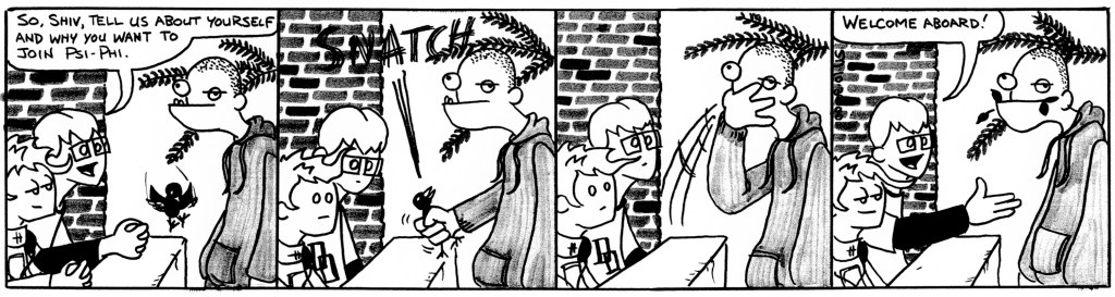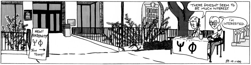 Psi Phi chronicles the story of Matt and Andy’s attempt at starting a fraternity. This arc includes the first appearances of Vanessa and Shiv. The strips were originally published from September, 2000 – February 2001.